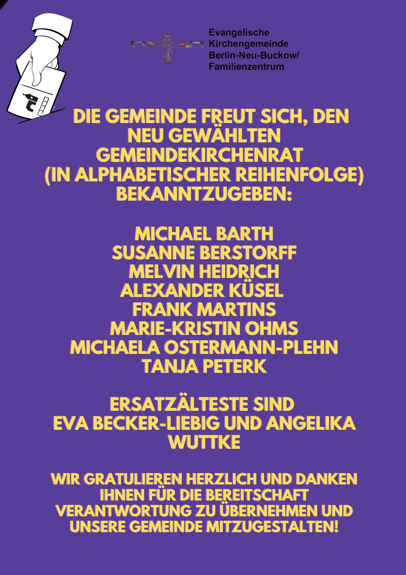 Die Gemeinde freut sich, den neu gewählten Gemeindekirchenrat (in alphabetischer Reihenfolge) bekanntzugeben: