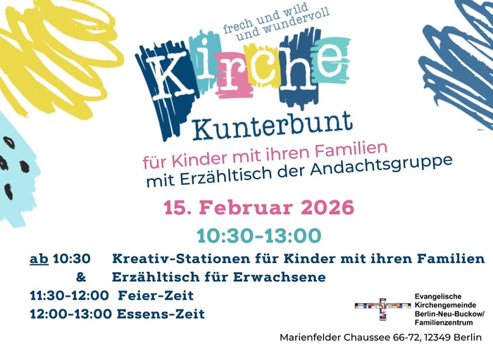 Am 15. Februar 2026 öffnet die „Kirche Kunterbunt Neu-Buckow“ wieder ihre Tore. Kirche Kunterbunt ist frech und wild und wundervoll. Kirche Kunterbunt ist Kirche, die Familien im Blick hat. Kirche Kunterbunt ist Qualitätszeit für Familie, für Kinder und ihre Bezugspersonen. Kirche Kunterbunt schafft Glaubensräume, in denen das Evangelium mit allen Sinnen erlebt wird. Es gibt einen Erzähltisch der Andachtsgruppe.
