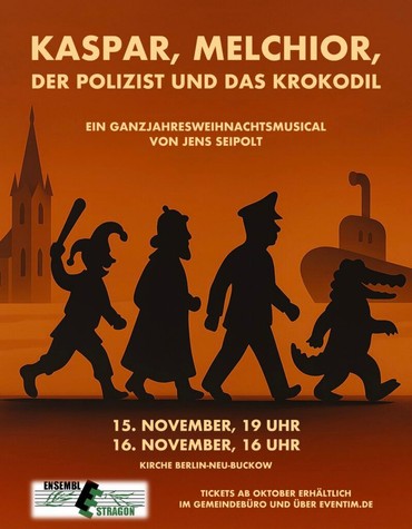 "Kaspar, Melchior, der Polizist und das Krokodil" ist das neueste musikdramatische Opus von Jens Seipolt. Nach umjubelter Premiere im Theater Ballhof Eins im Rahmen des 39. Deutschen Evangelischen Kirchentages in Hannover kommt "KMPK" nun endlich nach Berlin! Mit seinen gesellschafts- und kirchenkritischen Anspielungen läuft das Musical im November 2025 in der Ev. Kirche Berlin-Neu-Buckow.